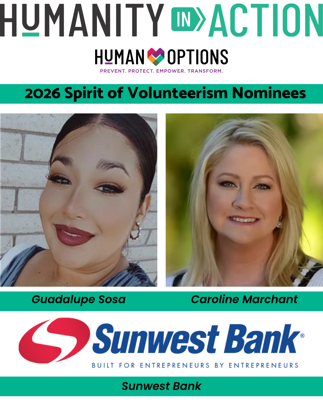 In honor of Volunteer Appreciation Month, Human Options is proud to spotlight our three nominees celebrated at OneOC’s 50th Anniversary Spirit of Volunteerism Awards. Their dedication reflects the impact of transforming awareness into action through Humanity in Action, our collective movement to end relationship violence in Orange County.
